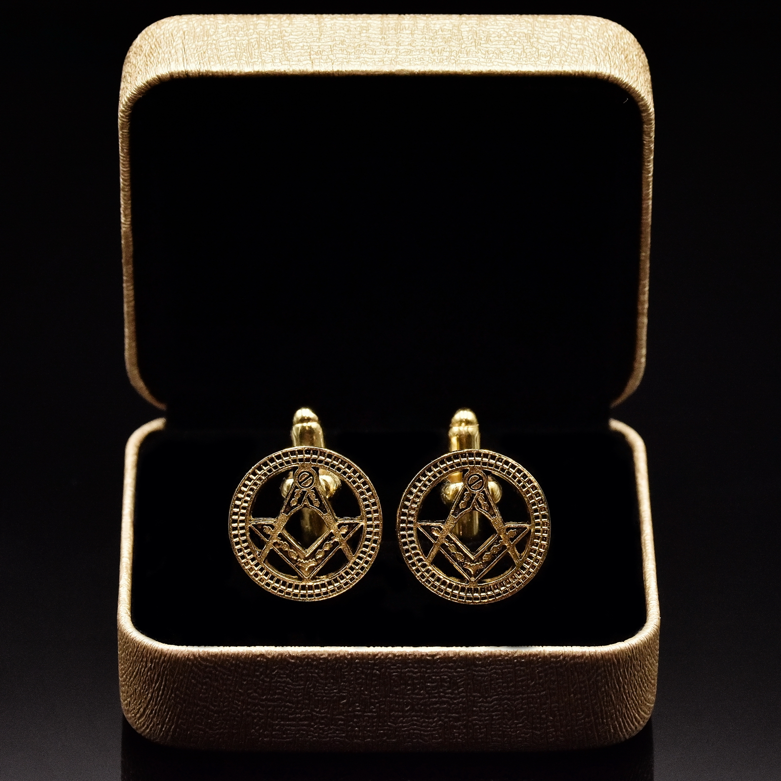 Butoni rotunzi aurii cu simbolul masonic Echer & Compas. Design decupat, bordură texturată, mecanism pivotant. Livrați în cutie de prezentare. Realizați din aliaj metalic cu finisaj auriu lucios, butonii au față rotundă cu motiv Echer & Compas, relief fin și bordură decorativă. Sistemul pivotant asigură prindere comodă și sigură. Cadou inspirat pentru inițiere, instalare sau aniversare masonică.