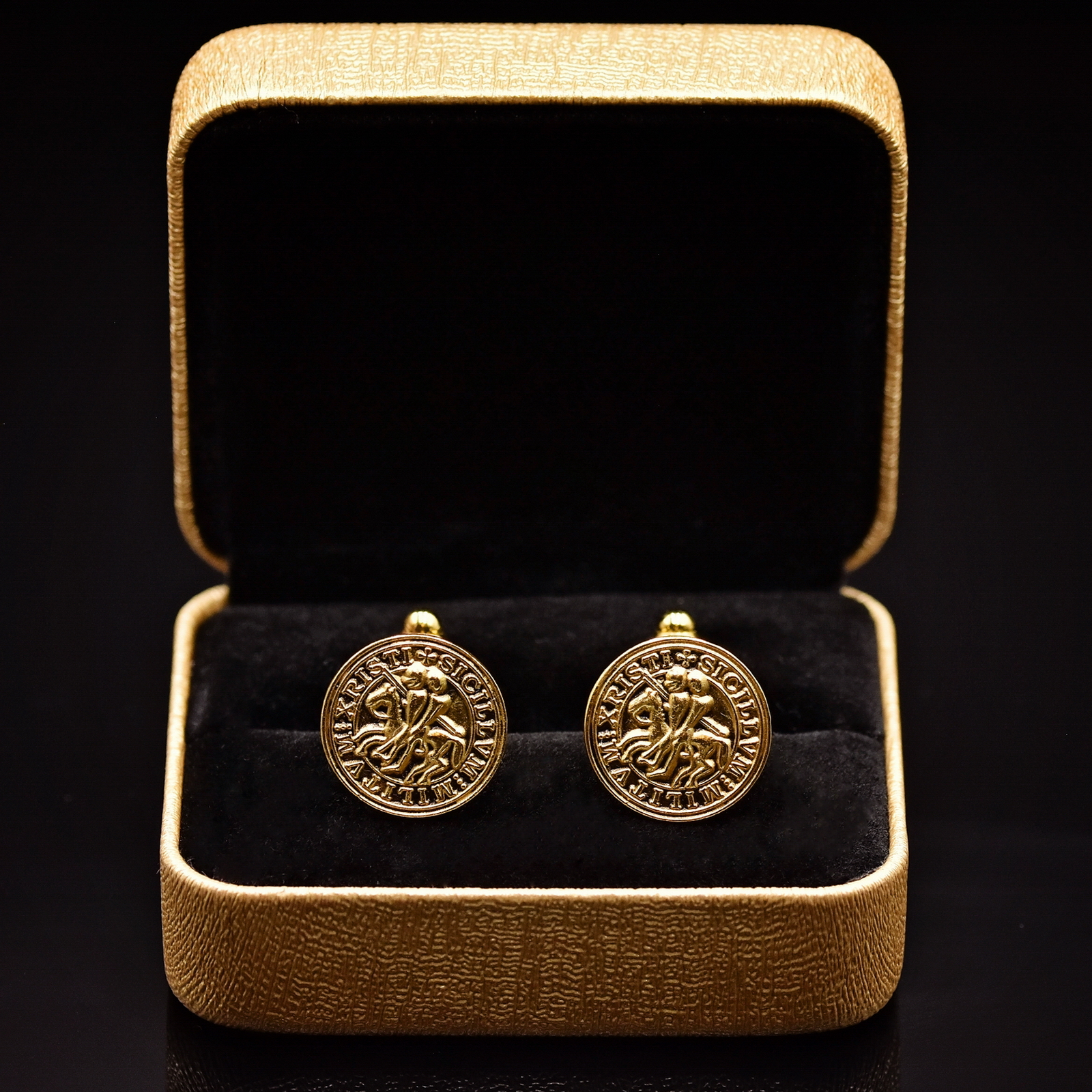 Butoni aurii rotunzi cu sigiliul istoric al Cavalerilor Templieri: doi cavaleri pe același cal și inscripția latină „Sigillum Militum Christi”. Mecanism pivotant, livrați în cutie de prezentare.