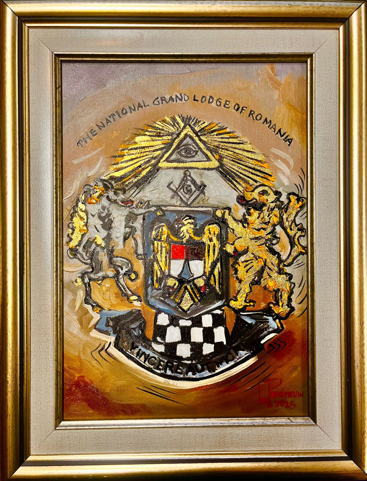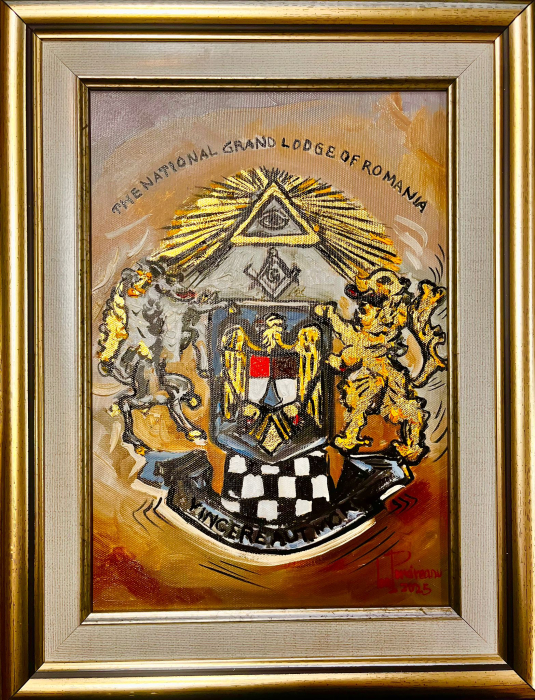 Acest tablou decorativ este pictat manual pe pânză și finalizat cu inserții autentice din foiță de aur, care scot în evidență detaliile și oferă un efect vizual de lux. Datorită combinației dintre textura pânzei, intensitatea culorilor și reflexiile calde ale foiței de aur, piesa se integrează perfect în decorul unei Loji, unui birou sau unui spațiu dedicat. Este, de asemenea, un cadou inspirat pentru un Frate, apreciat pentru eleganța și semnificația lui.