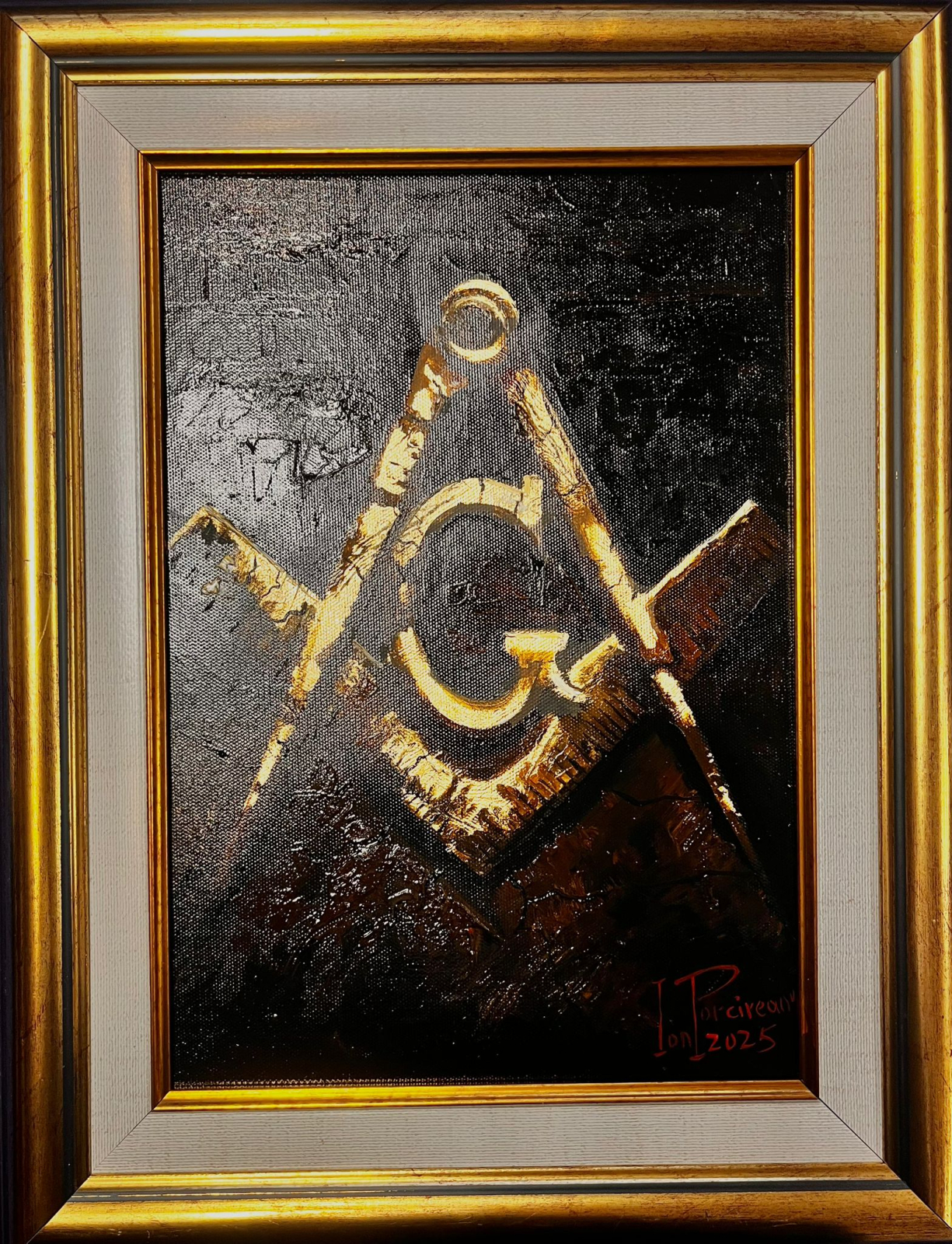 Tablou decorativ pictat manual pe pânză, realizat cu inserții din foiță de aur care scot în evidență echerul, compasul și litera G. Fundalul închis, texturat, pune în contrast strălucirea aurie a simbolurilor masonice, dând lucrării profunzime și un aspect solemn. Lucrarea este ideală pentru expunerea într-o Lojă, într-un birou sau într-un spațiu dedicat, dar și ca dar deosebit pentru un Frate. Reflexiile foiței de aur și stilul pictural conferă tabloului un caracter elegant, discret, dar foarte expresiv.